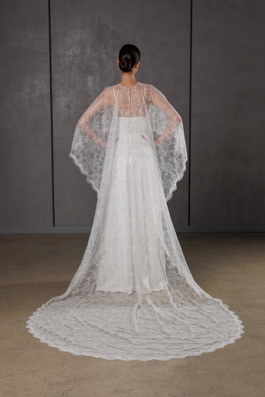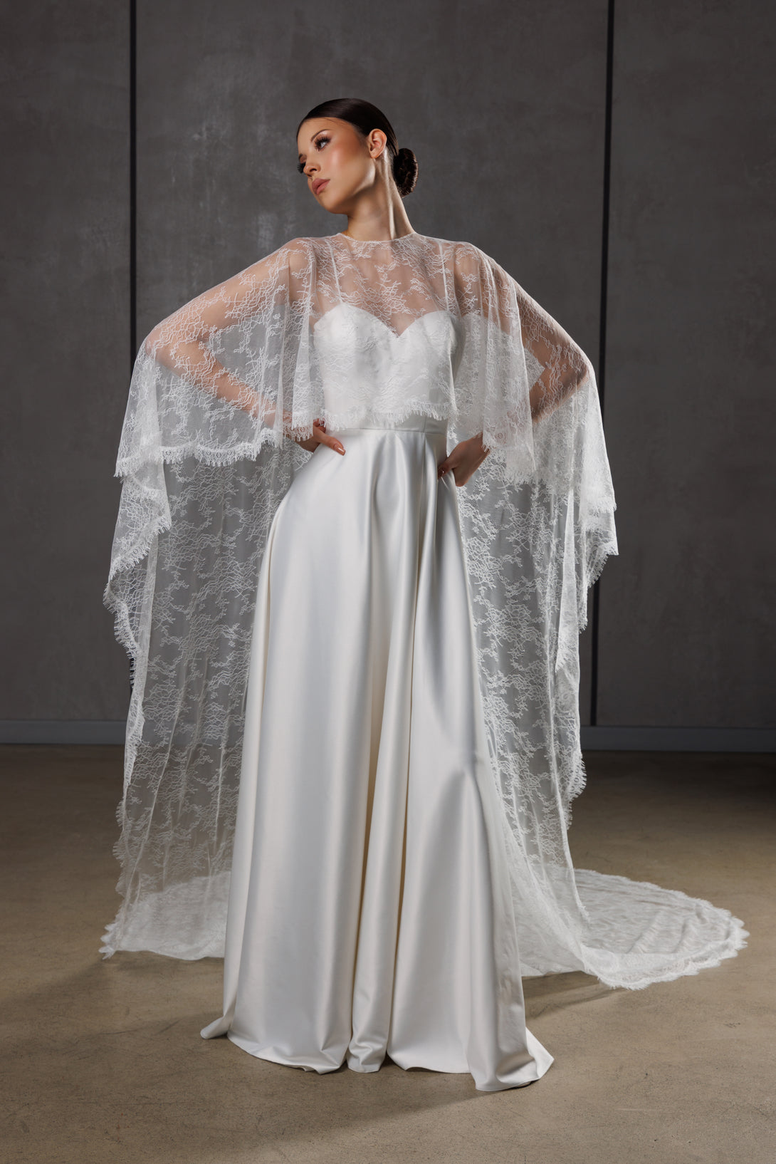 Perfect for cooler days or modest ceremony looks, this cape transitions easily from a refined cover-up to a chic reception accessory, giving you two stunning bridal styles in one.