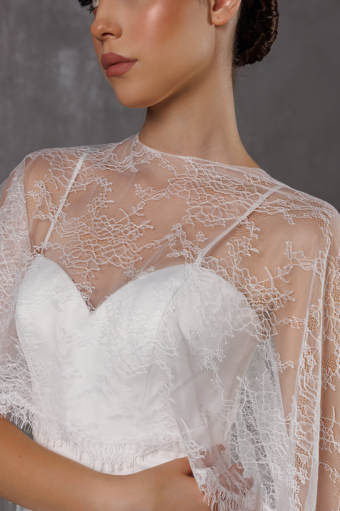 Transform your bridal look with this elegant lace wedding cape, combining style, comfort, and versatility. Made from soft, sheer chantilly lace, it drapes gracefully over the shoulders, adding a light, romantic touch without hiding your dress.