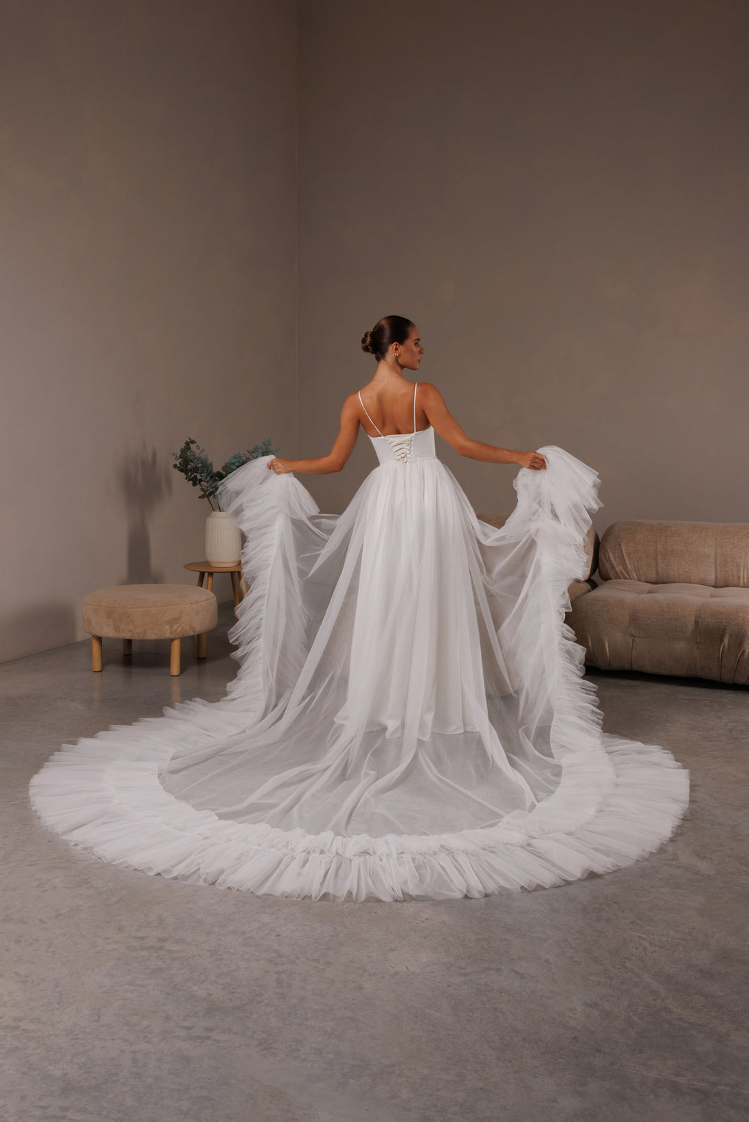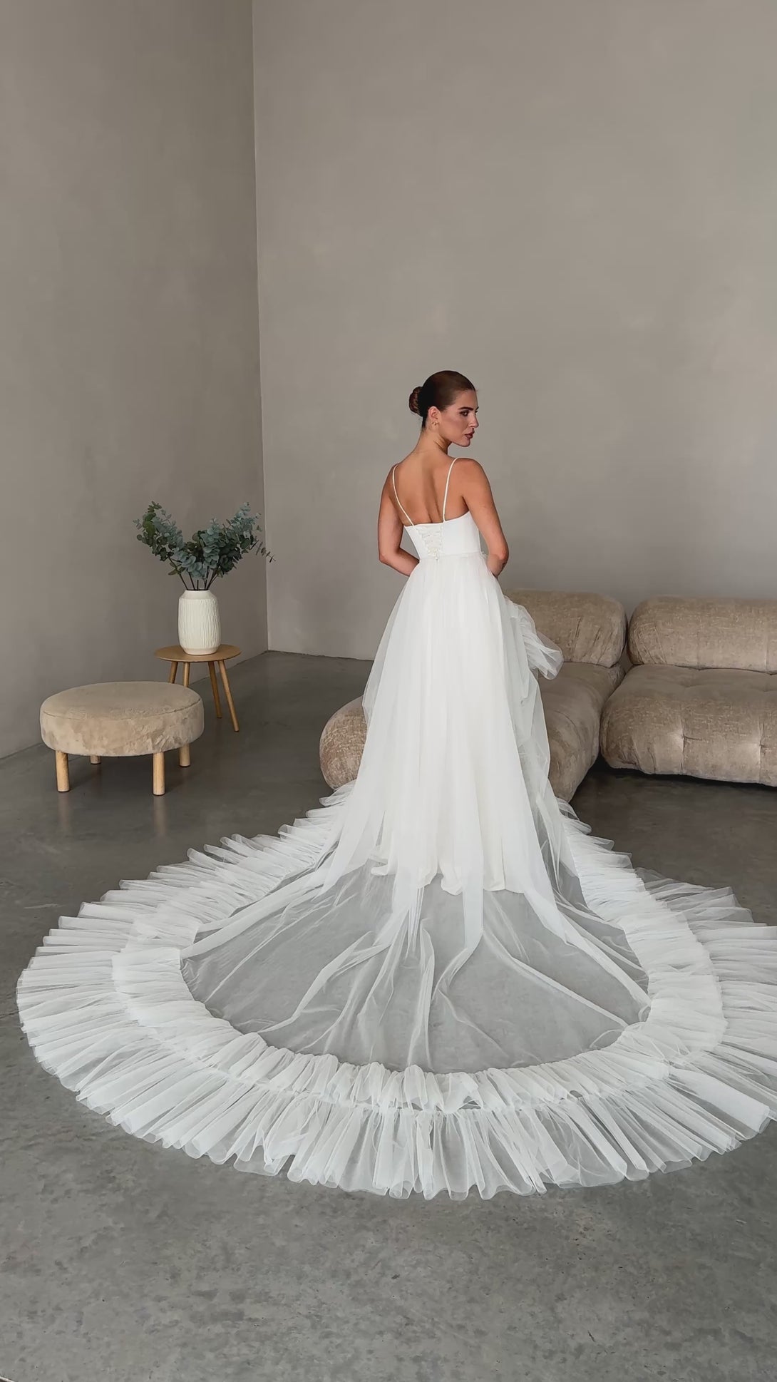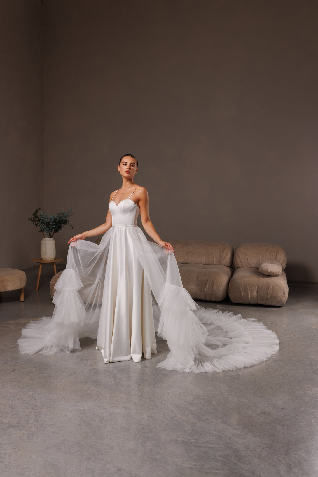 Elevate your bridal style with this romantic detachable tulle overskirt, created for modern brides who value elegance and versatility. Made from soft, lightweight tulle, it adds a touch of ethereal volume and a graceful train to any wedding gown. Perfect for transforming your look from ceremony to reception — or for that unforgettable, fairytale entrance.