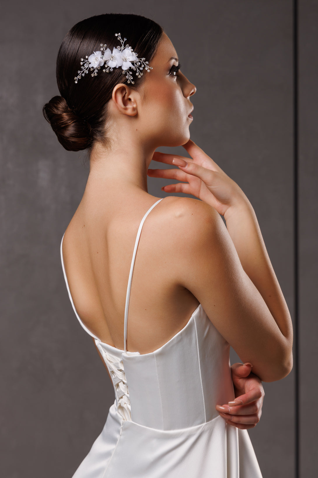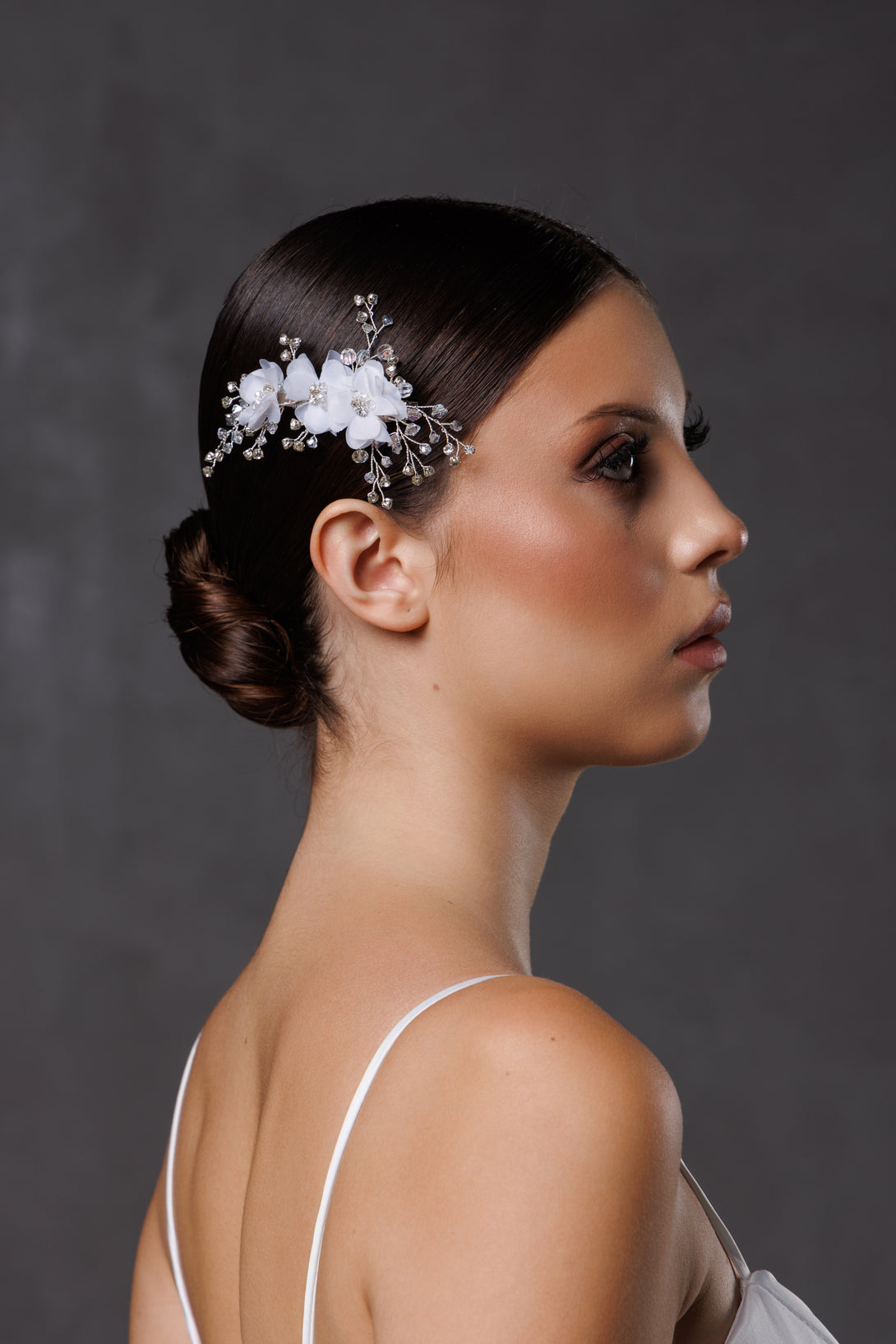 Perfect for a bun or updo, it adds a touch of light, floral elegance to any bridal hairstyle.