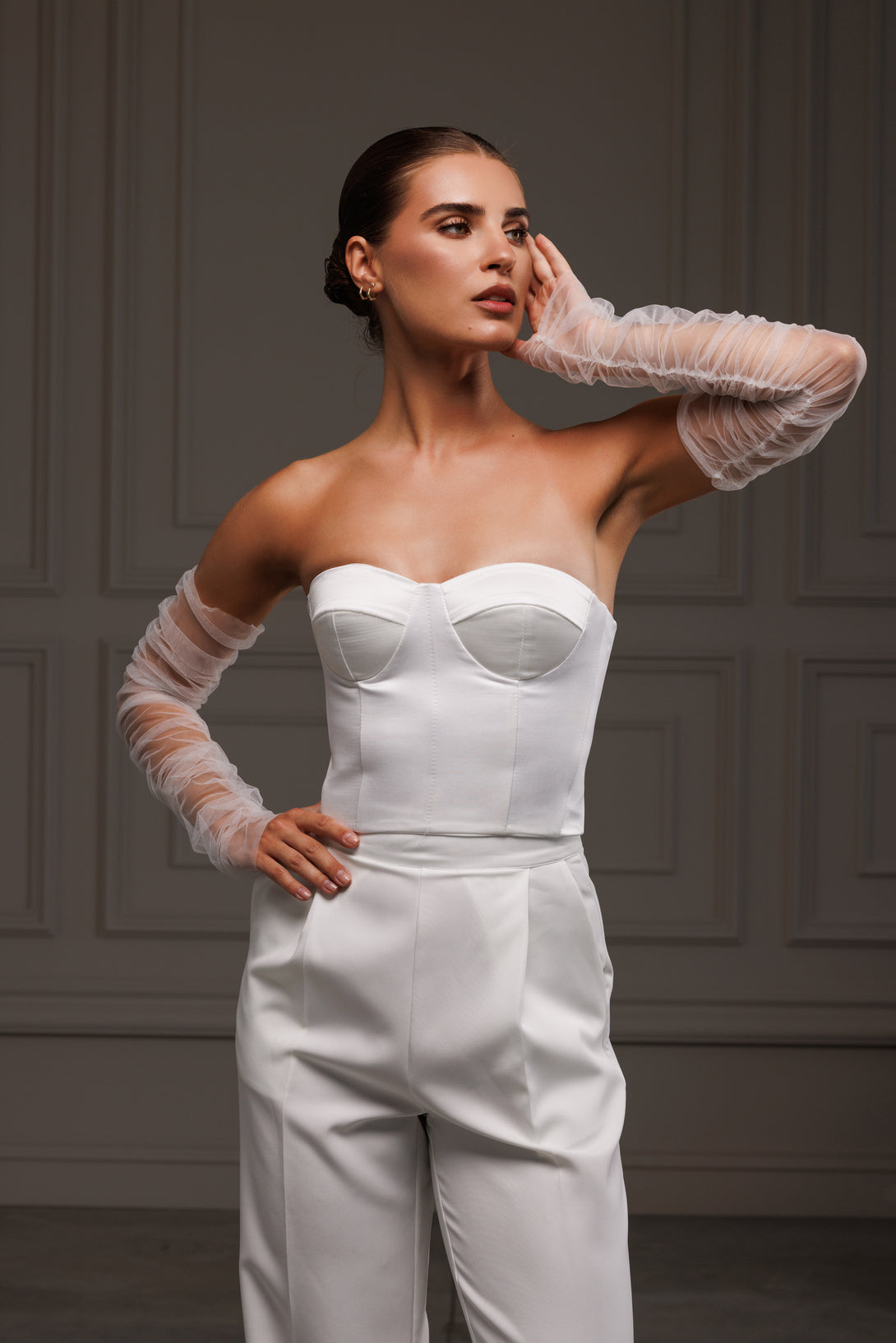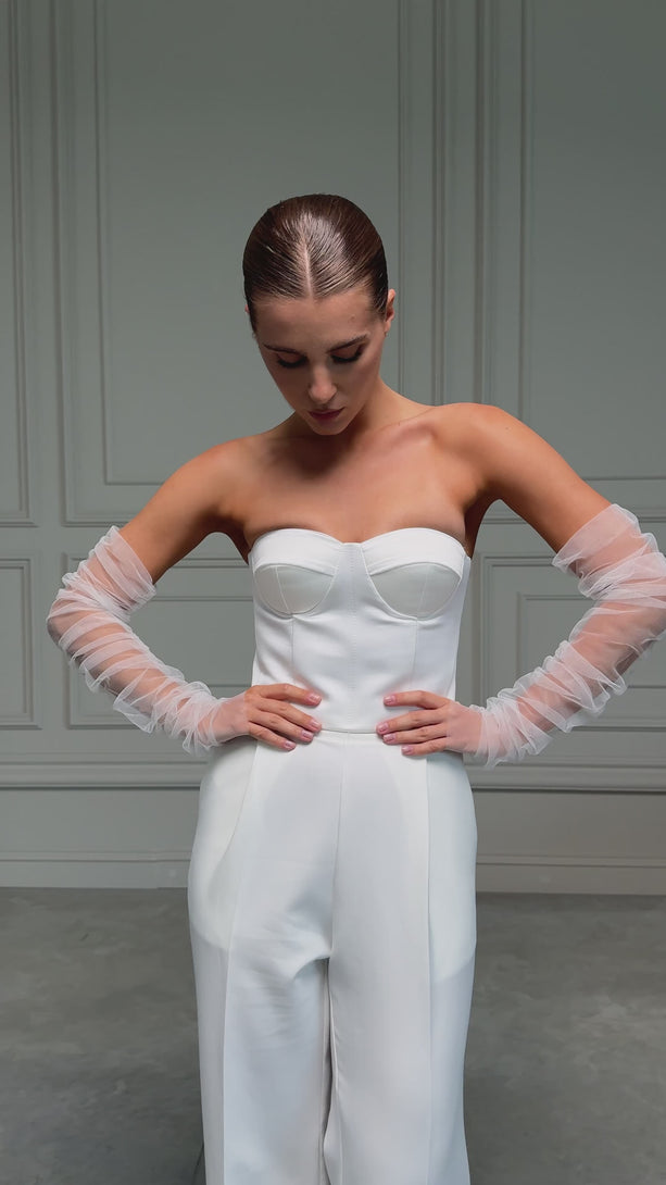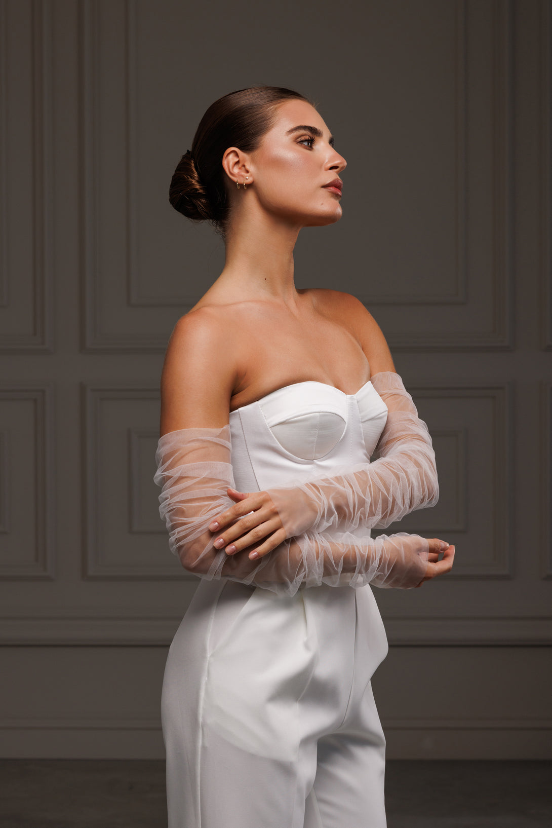 Soft fingerless tulle draped sleeves — a romantic accessory that perfectly complements your bridal look. Lightweight and elegant, they create a delicate flowing effect and pair beautifully with any wedding gown or overskirt.