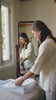 Hang in bathroom during hot shower (10-15 min, door closed). Don't let veil get wet.