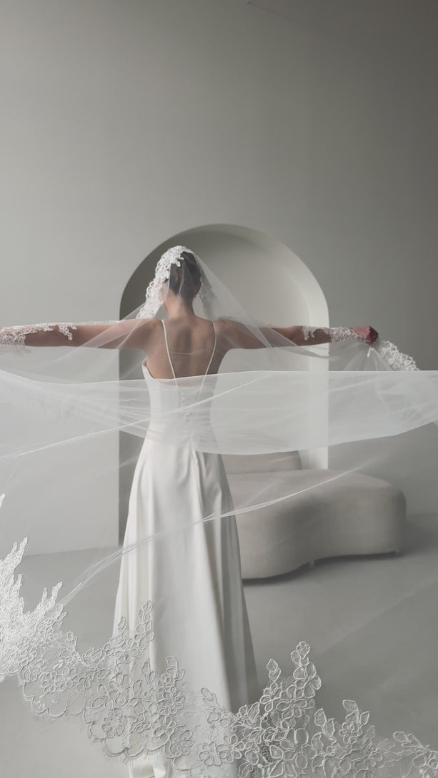 Mantilla lace trim veil ✔︎Details: soft tulle one layered rounded mantilla veil decoration with lace trim attachment with a metal comb available in different lengths Width - 79" Color - light...