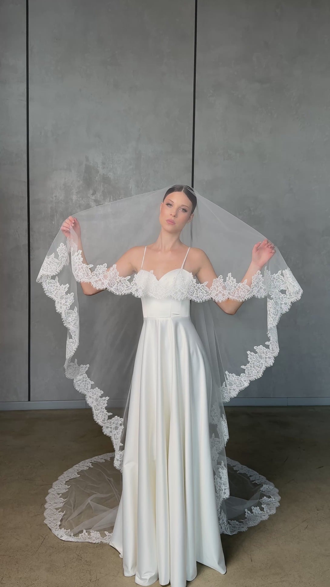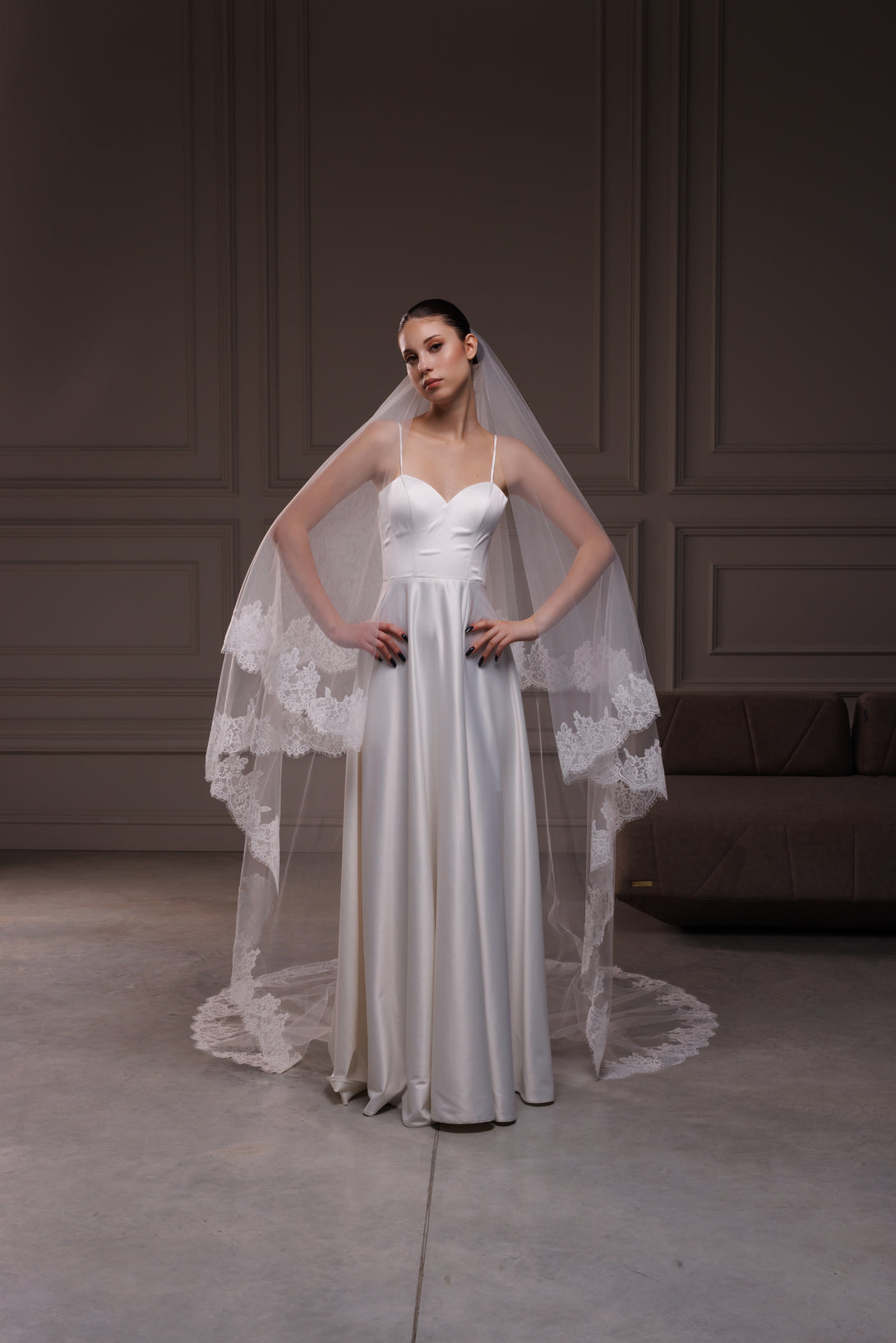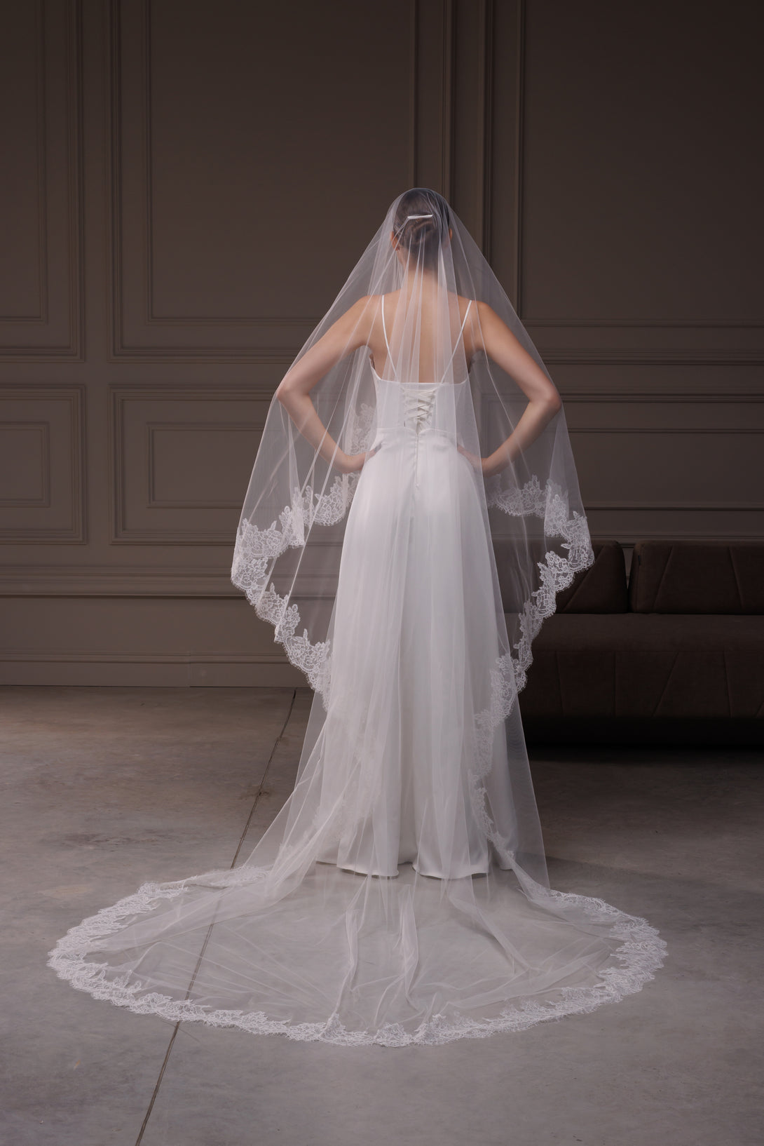 Romantic and timeless two-layer drop veil made from soft tulle and finished with a delicate lace trim along the edge. The classic drop design creates a natural blusher effect, adding movement and gentle volume to your bridal look. Perfect for traditional or modern gowns.