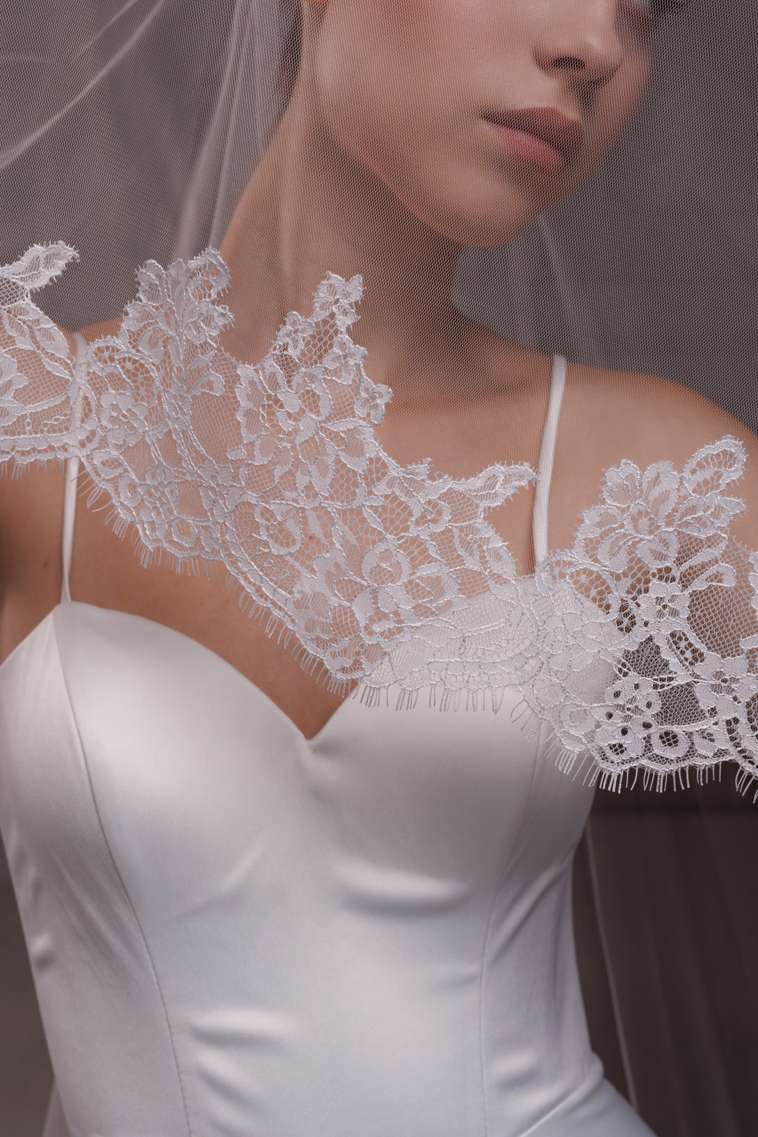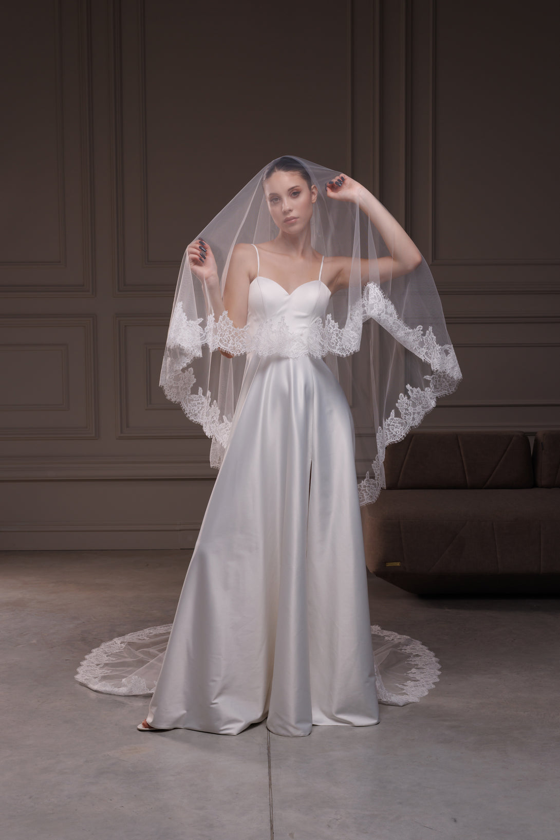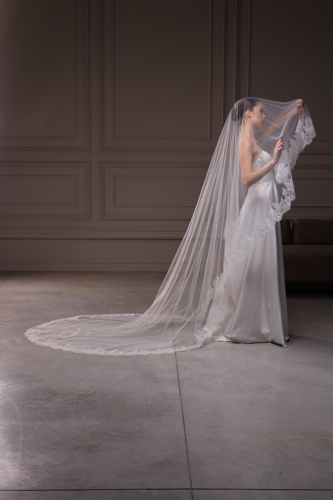 Romantic and timeless two-layer drop veil made from soft tulle and finished with a delicate lace trim along the edge. The classic drop design creates a natural blusher effect, adding movement and gentle volume to your bridal look. Perfect for traditional or modern gowns.